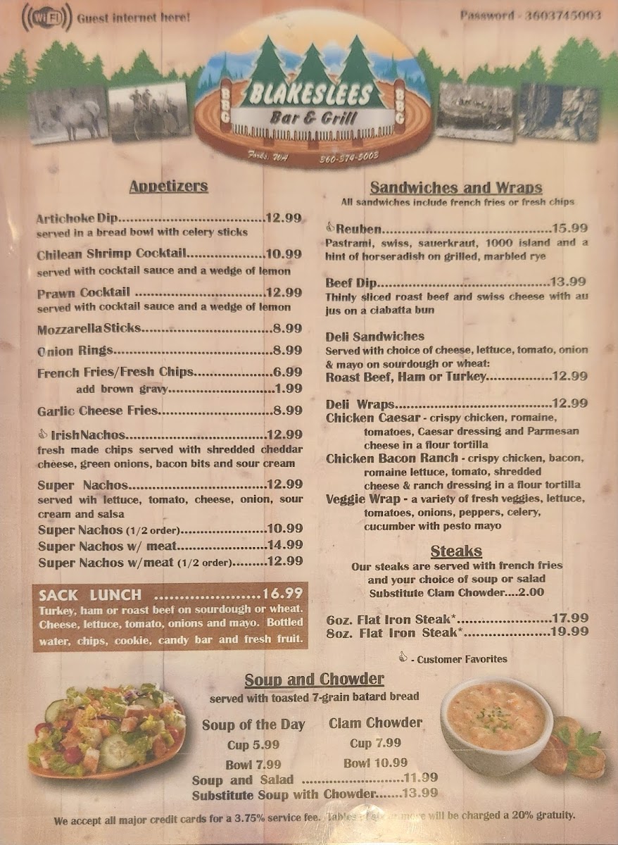 Introducing the menu at Blakeslees Bar and Grill, a must-visit spot in Forks, WA, where culinary delights meet small-town charm. This local gem offers a diverse selection, from mouthwatering burgers like the Jalapeno Burger to the indulgent French Dip. Each dish is crafted with care; patrons rave about the crispy sidewinder fries and the acclaimed clam chowder, making it a top choice for comfort food enthusiasts.